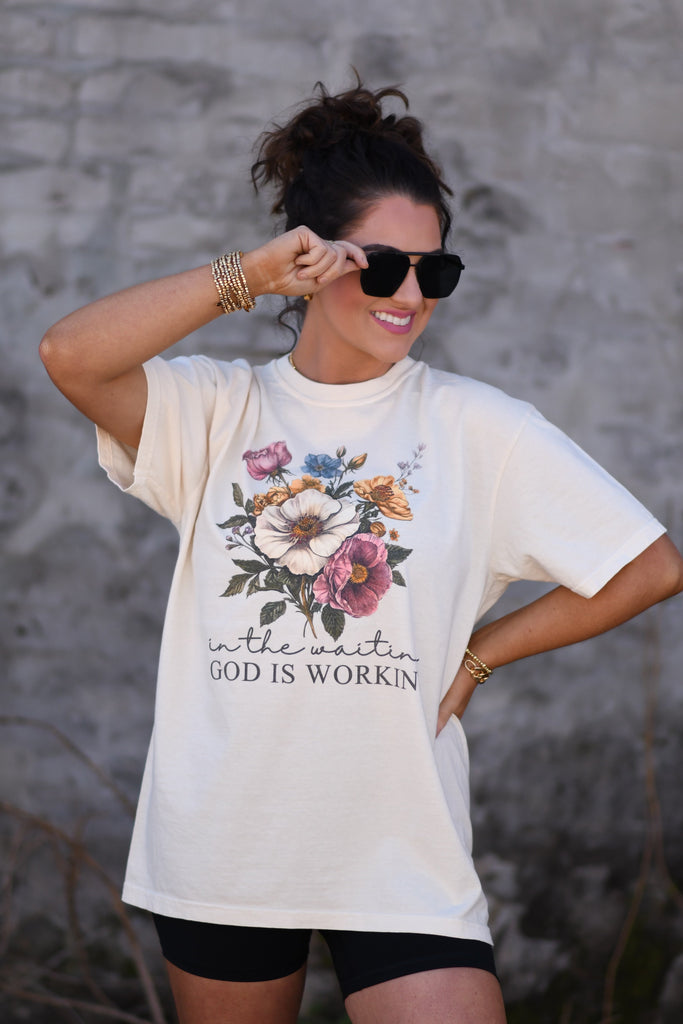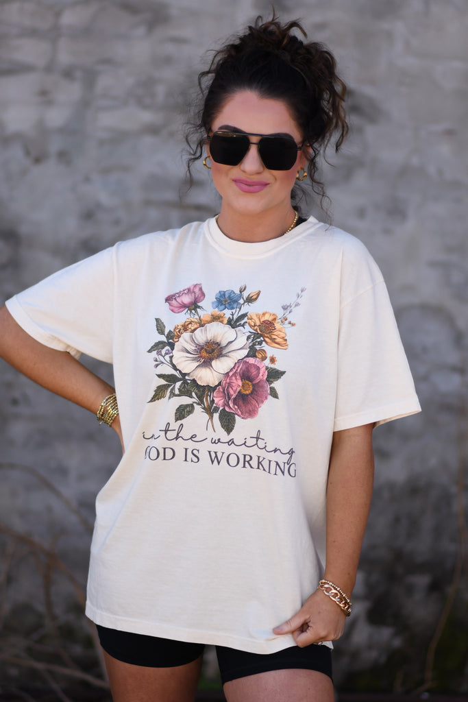 The In The Waiting God Is Working Floral Tee destined to impress, and priced at only $30.99, for a limited time.