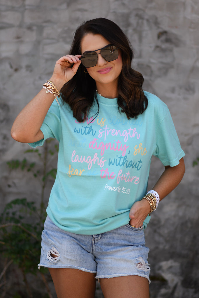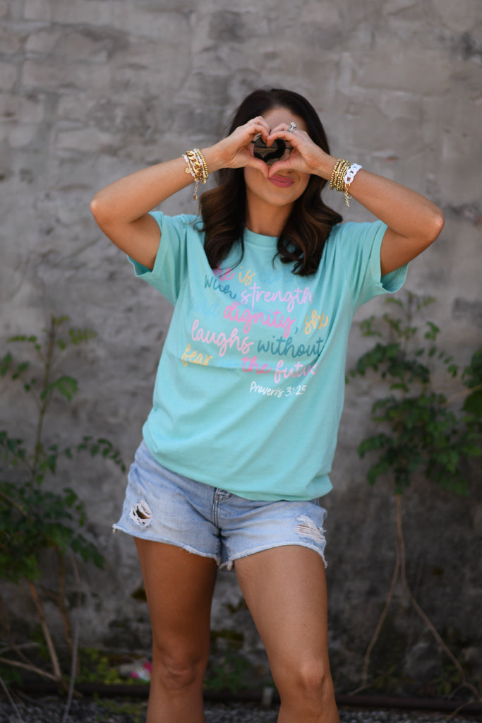Life is too short to live without the She Is Clothed With Strength Proverbs Tee. Be happy. Be Content. Be Satisfied.