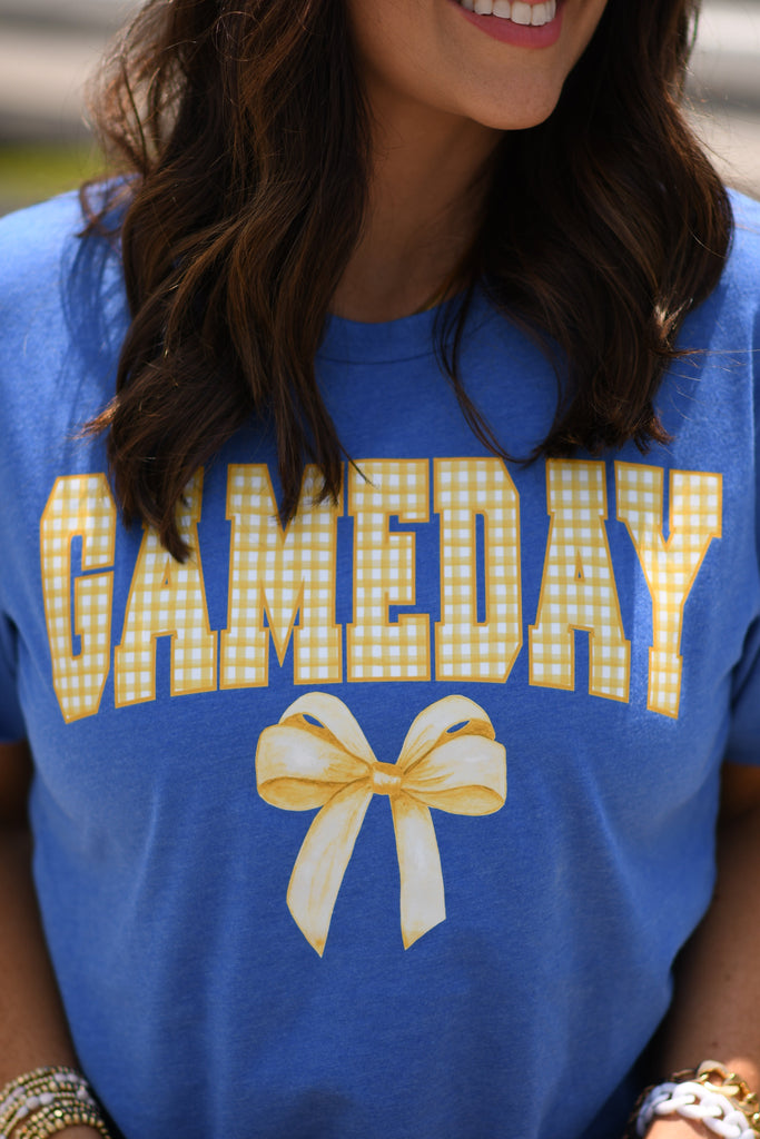 The Game Day Gingham Bow Royal Tee is the product you didn't think you need, but once you have it, something you won't want to live without.