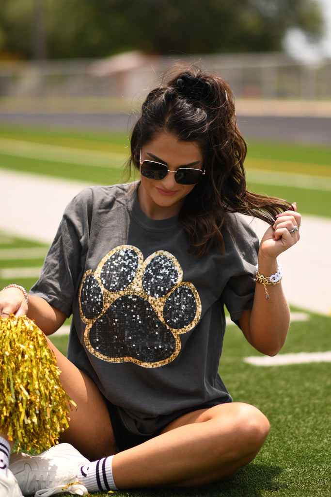 The Black & Gold Faux Glitter Paw Print Tee is a sensational customer favorite, and we hope you like it just as much.