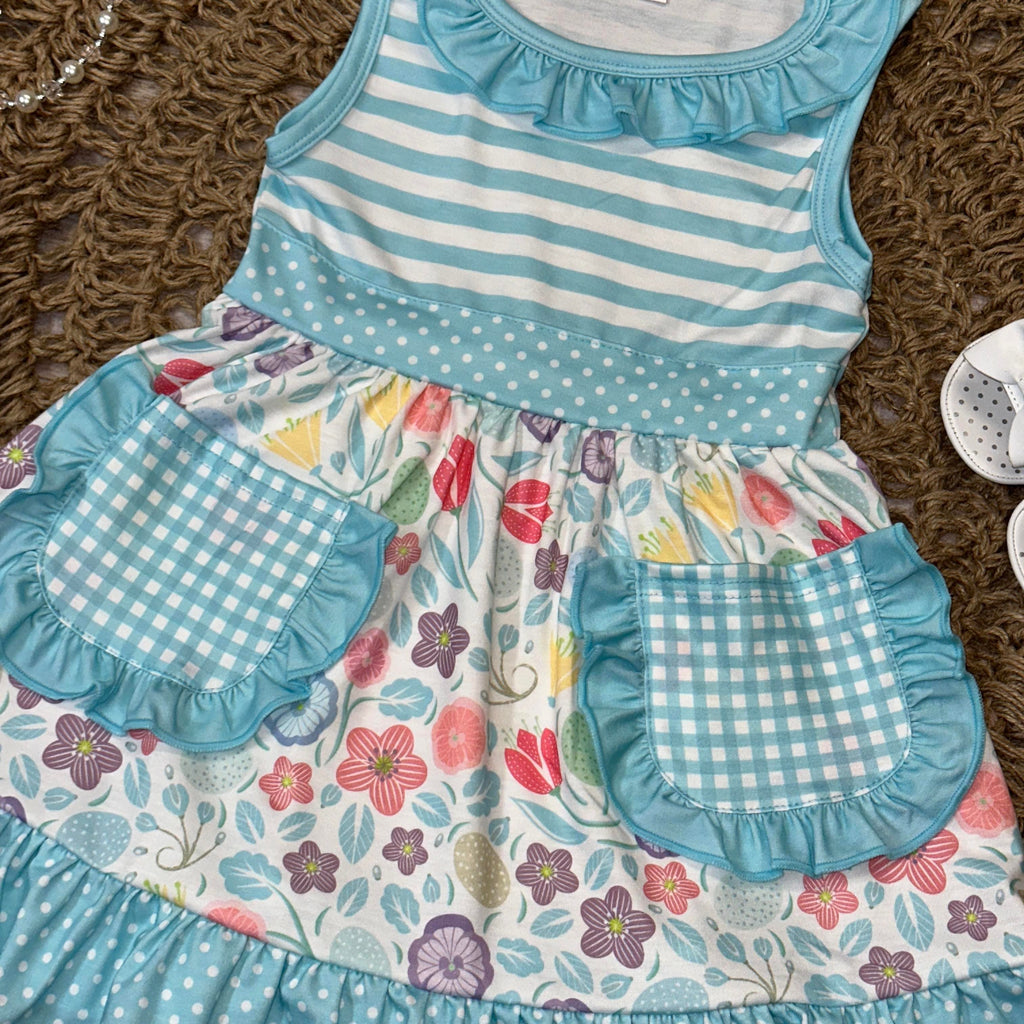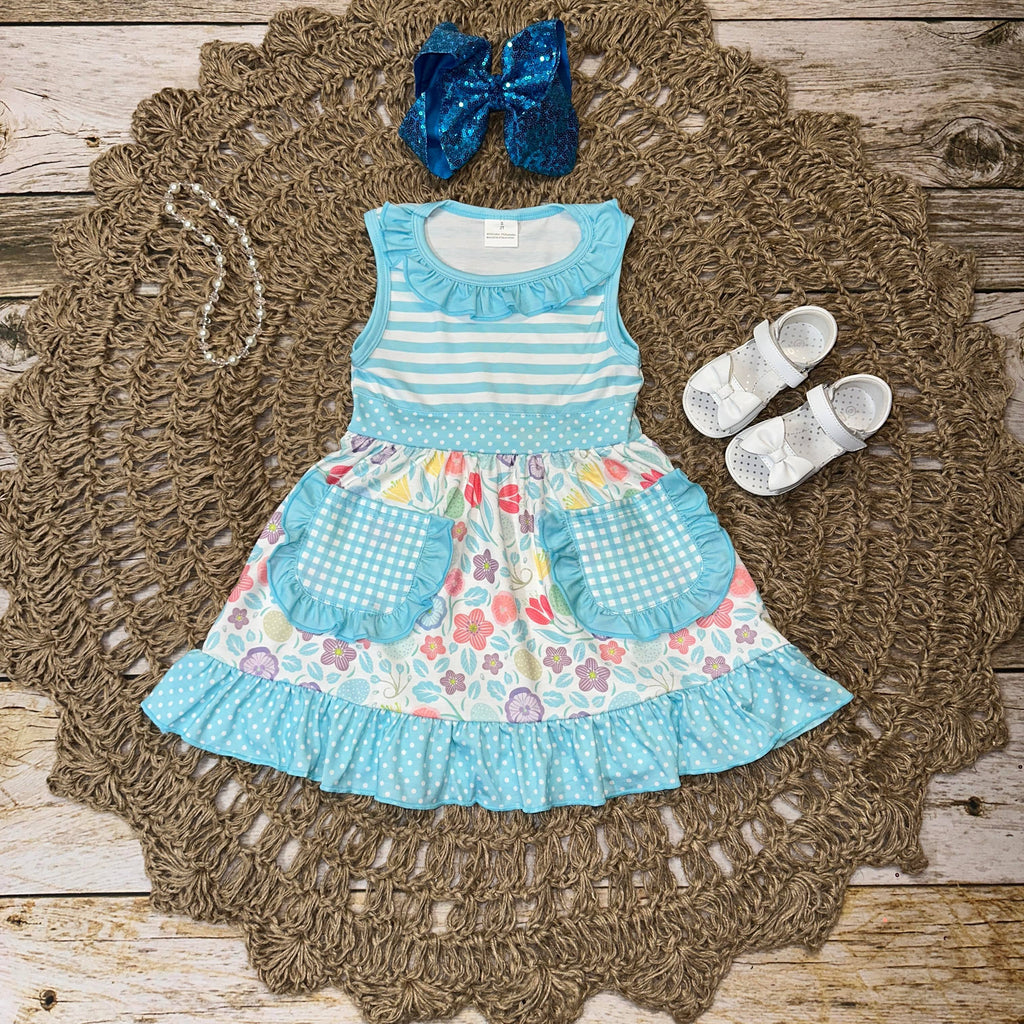 Light Blue Stripe and Floral Ruffle Pocket Dress